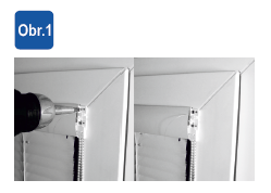1. Žalúziu priložíme na horný profil okna a vycentrujeme. Do predvŕtaných otvorov v ráme okna nasadíme skrutky a dotiahneme.